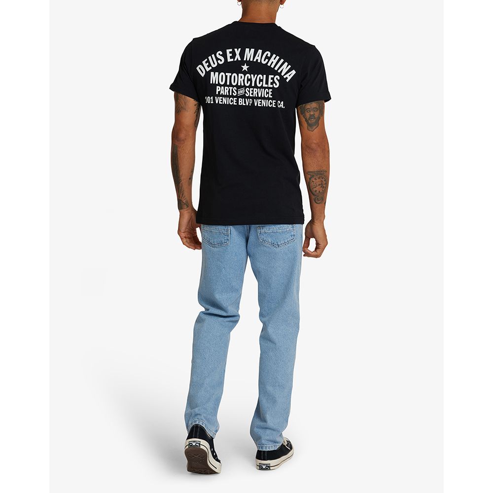 Esta camiseta negra de corte regular para hombre presenta un estampado original de Deus en el panel delantero y trasero sobre un jersey de algodón suave de 20/1s y 190 g/m².